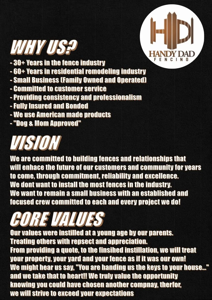 We always have the opportunity to learn, not only from our past but also the present. For over 30 years in the remodeling and fence industry and all those we’ve spent time working for and with, we’ve had the opportunity to see both the good and bad- from the sales side of the business to the on-site encounter with homeowners to the physical installation and work. During the past 30 years, we’ve had the opportunity to grow both personally and professionally. We’ve learned what dedication, integrity, commitment and business ethics truly entail. After years of being in the shadow and saying, “their business ethics and ours don’t align,” we stepped away to start Handy Dad Fencing.
